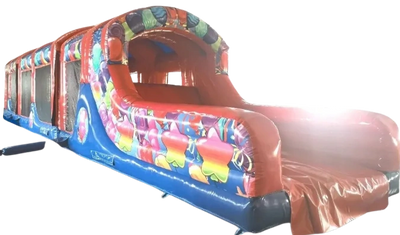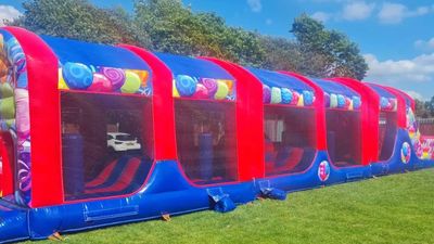 Featuring a 6ft platform slide, 2 racing lanes, biff bash obstacles and an up and over wall, this blue and red party themed obstacle course offers endless fun for all ages.